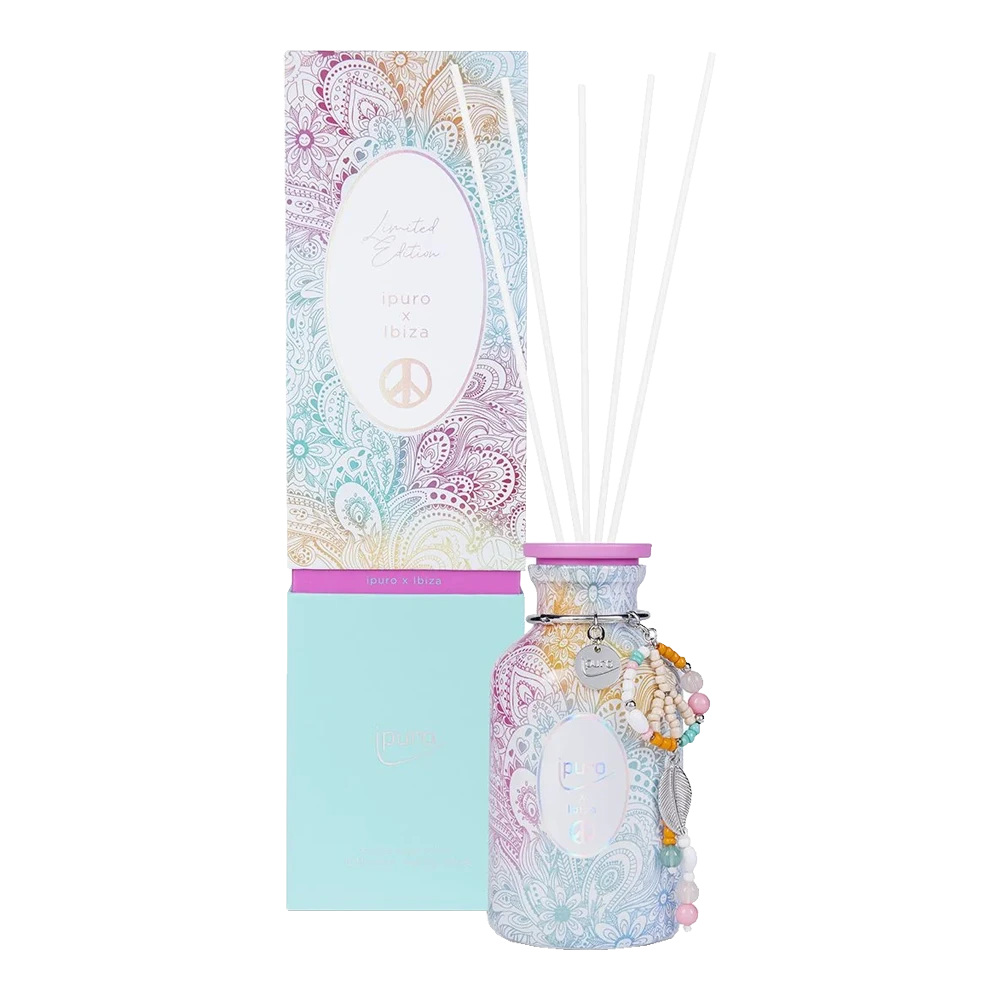 De Limited edition Ipuro Geurdiffuser Ibiza 240ml is een diffuser die de heerlijke geur afgeeft van de luchtige boho-levensstijl op Ibiza. Met de geur van vijgen, rozen en perzik en groene tonen. De fles is prachtig gedecoreerd en heeft een luxe uitstraling, waardoor deze prachtig staat in elk interieur. Limited Edition Geurstokjes!